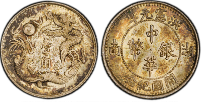湖南洪宪元年开国纪念中华银币壹角(PCGS MS65)此枚 PCGS MS65 评级币,品相堪称顶级,龙图细节纤毫毕现,包浆自然醇厚,光泽温润,是同类藏品中的佼佼者。尤为难得的是,据 PCGS 评级网站数据,此币全球仅见六枚评分记录,本品以 MS65 位居亚军,距冠军仅差半分(MS65+),在存世量与品相双重稀缺加持下,其收藏价值无可估量。参考 2026 年 4 月最新市场行情,PCGS MS64 评级币拍卖成交价已达 115 万元