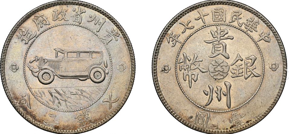 民国十七年(1928)贵州省政府造壹圆银币 “汽车币”。MS62 NGC。三叶草版。这枚汽车币可谓集合了三重非凡特质于一身,不论珍罕程度、外观和保存状态都堪称一绝。有别于图录编者过往经手的大多数 VF 或 XF 品相、并带有评级公司批注的例子,此币呈现出原本质朴的外观。币面在灯光照射下闪闪生辉,宛如初铸的图文上染出一脉柔淡光泽,并以轻和悦目的缎亮光芒加以点缀。虽然我司曾经手品相相近的原厂状态例子,但多为较常见的二叶草版,令此币对省造钱币的收藏家必定魅力难挡。贵州汽车币闻名遐迩,在评分记录中共见超过 450 例获得评分,但仅有一例更胜当前此枚,本品(NGC MS62,三叶草版)市场交易价约人民币 180-220 万元,正规拍卖行拍卖估值约人民币 200-240 万元