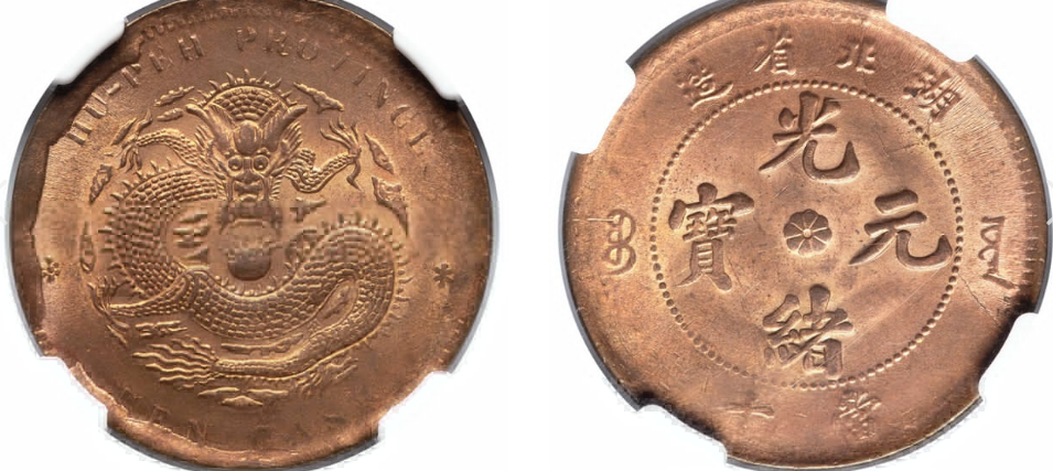 此为 1902 至 1905 年湖北省造光绪元宝当十铜元,为铸造错版,正面带有模具裂纹版别特征,经 NGC 评级为 MS65 Red,原铜光保存较好,品相状态优异,该枚钱币拍卖估价约人民币 7200–10800 元,曾以人民币 20700 元成交,版别特征明显,品相少见,具备收藏趣味与市场价值,是湖北铜元中品相与版别均较为突出的藏品。